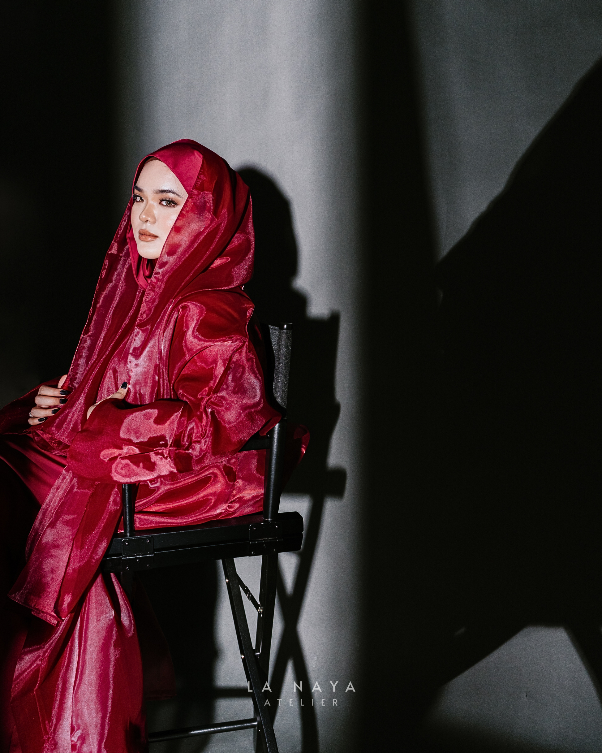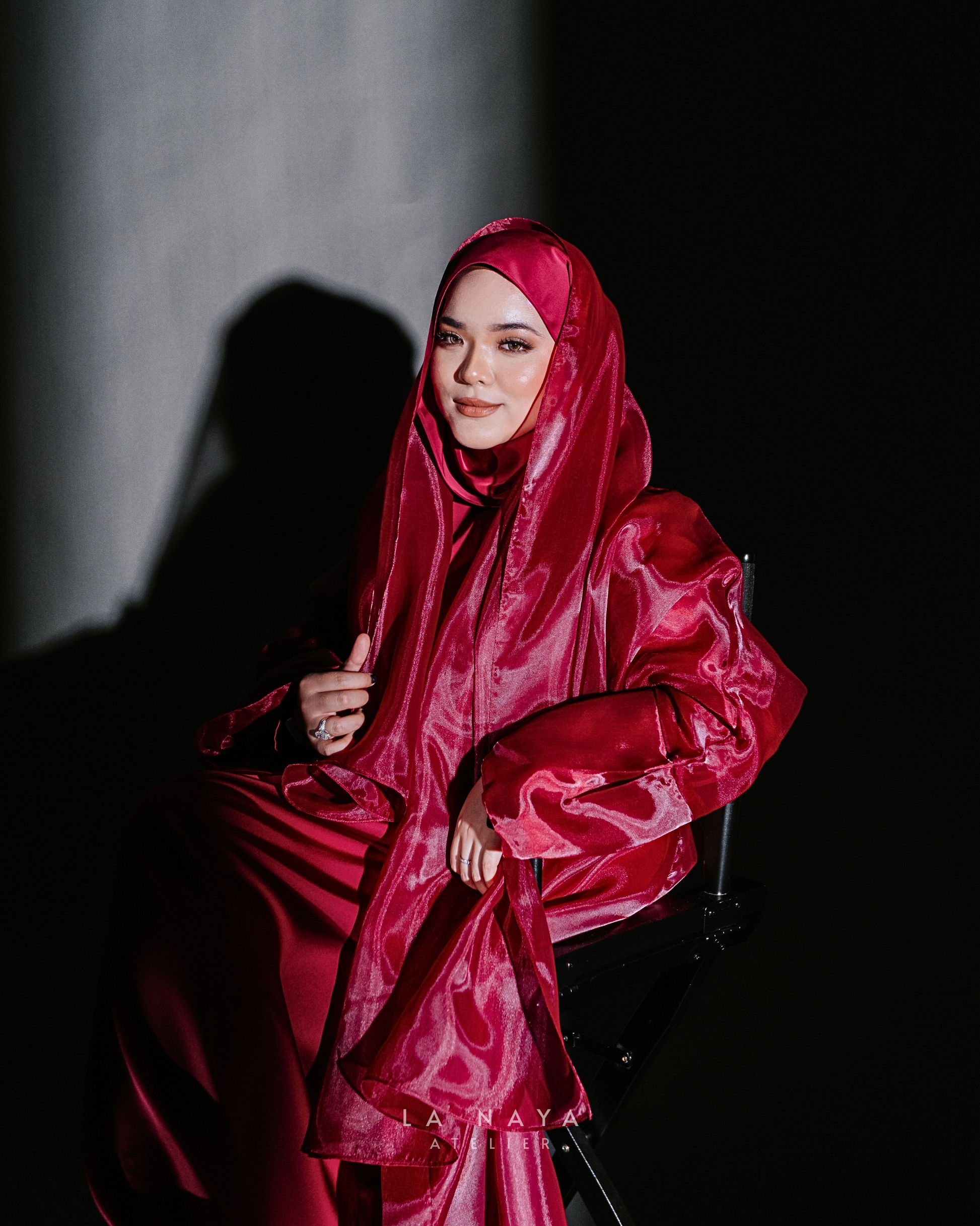 Our founder's special — Rosso. Rosso features a flowy organza outer paired with a heavy satin inner, each completed with its own matching shawl. The pairing of weighted satin and sheer organza creates contrast — bold in form, delicate in finish.