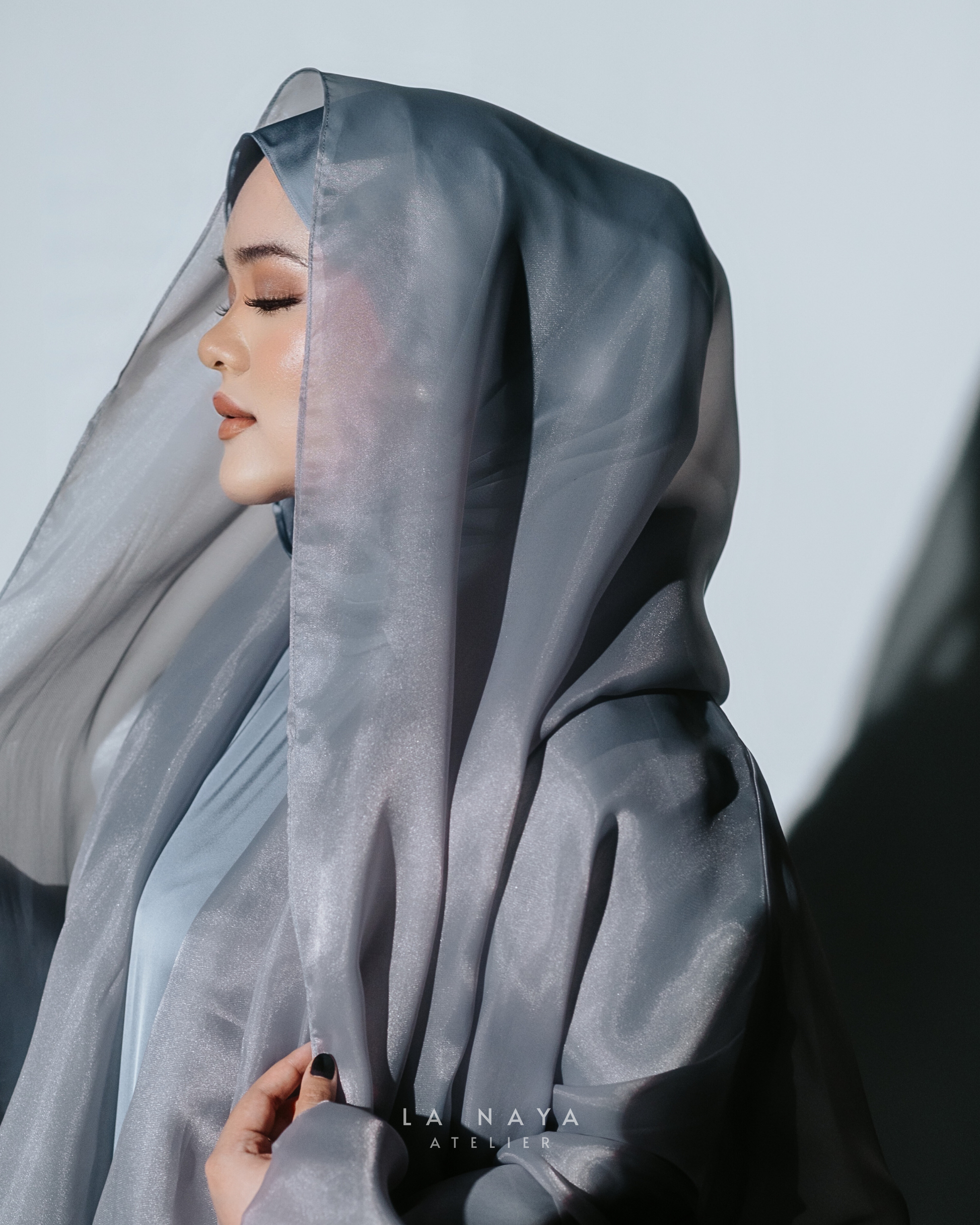 Azzurro is a soft blue with a quiet radiance - calm, cool, and endlessly refined. The pairing of structured heavy satin and sheer organza gives it both form and lightness.